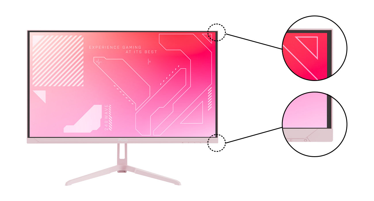 快適なプレイと没入感を実現するため、左右と上のベゼルは極限まで薄くしました。 下部分は、お気に入りのカラーが目に入るようにあえて薄くせず従来通りのサイズを採用。 お部屋に設置したときにもきちんと色を認識できることで気持ちが高揚します。