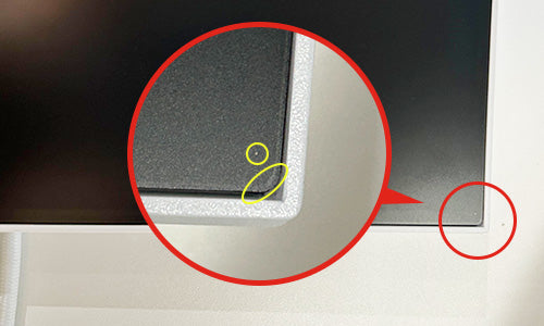 モニター画面のコーナー付近に丸いマーキングおよびフィルムが浮いているような模様が見えることがありますが、いずれも製造上の仕様となります。故障の原因となりますので、製品の一部であるフィルムを無理やりはがしたり擦ったりしないでください。