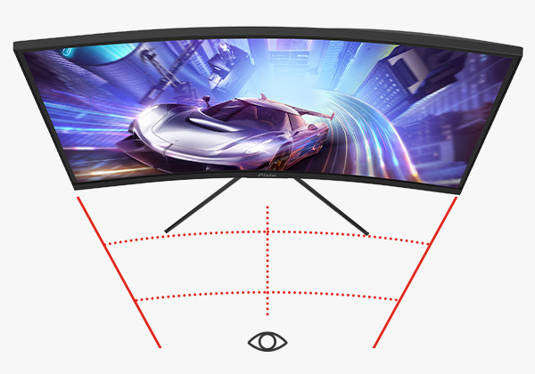 視界を囲むように緩やかにカーブしたパネルは、画面の中央から端まで、目から一定の距離を保つことでリアルな臨場感を感じられます。 -